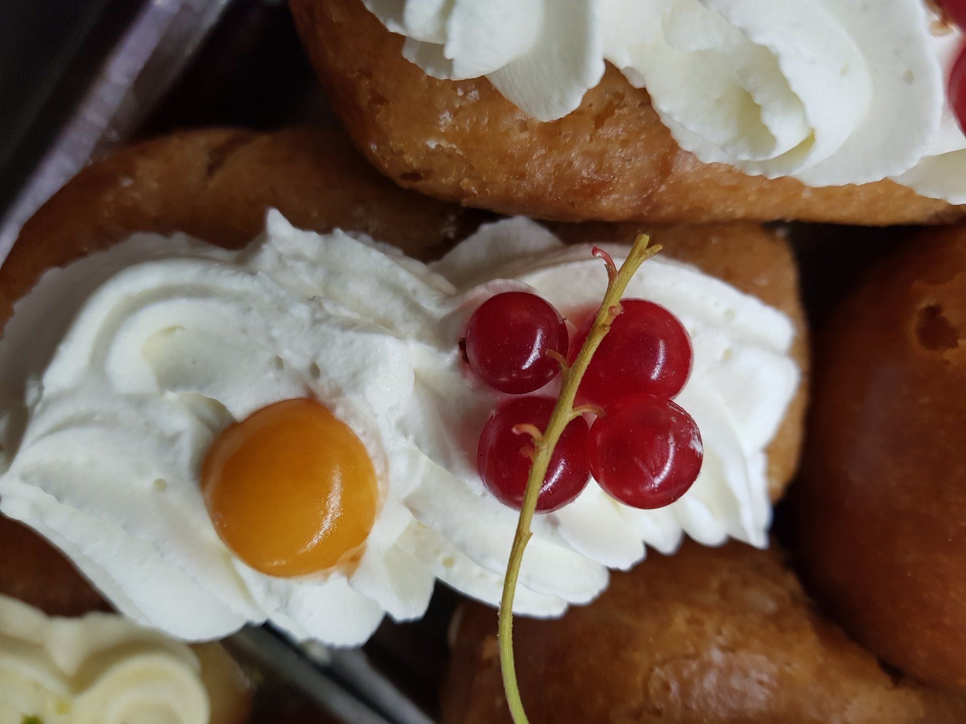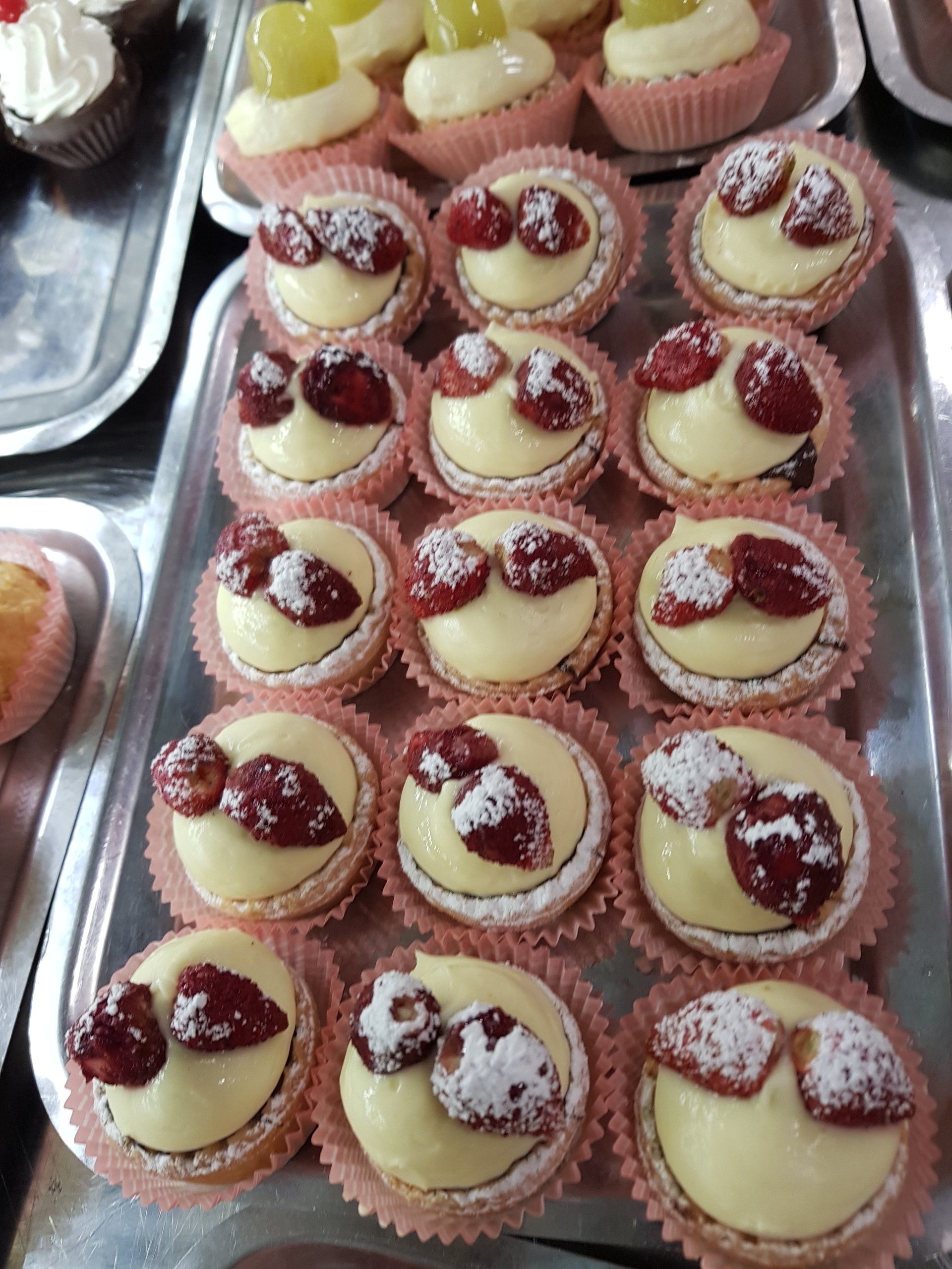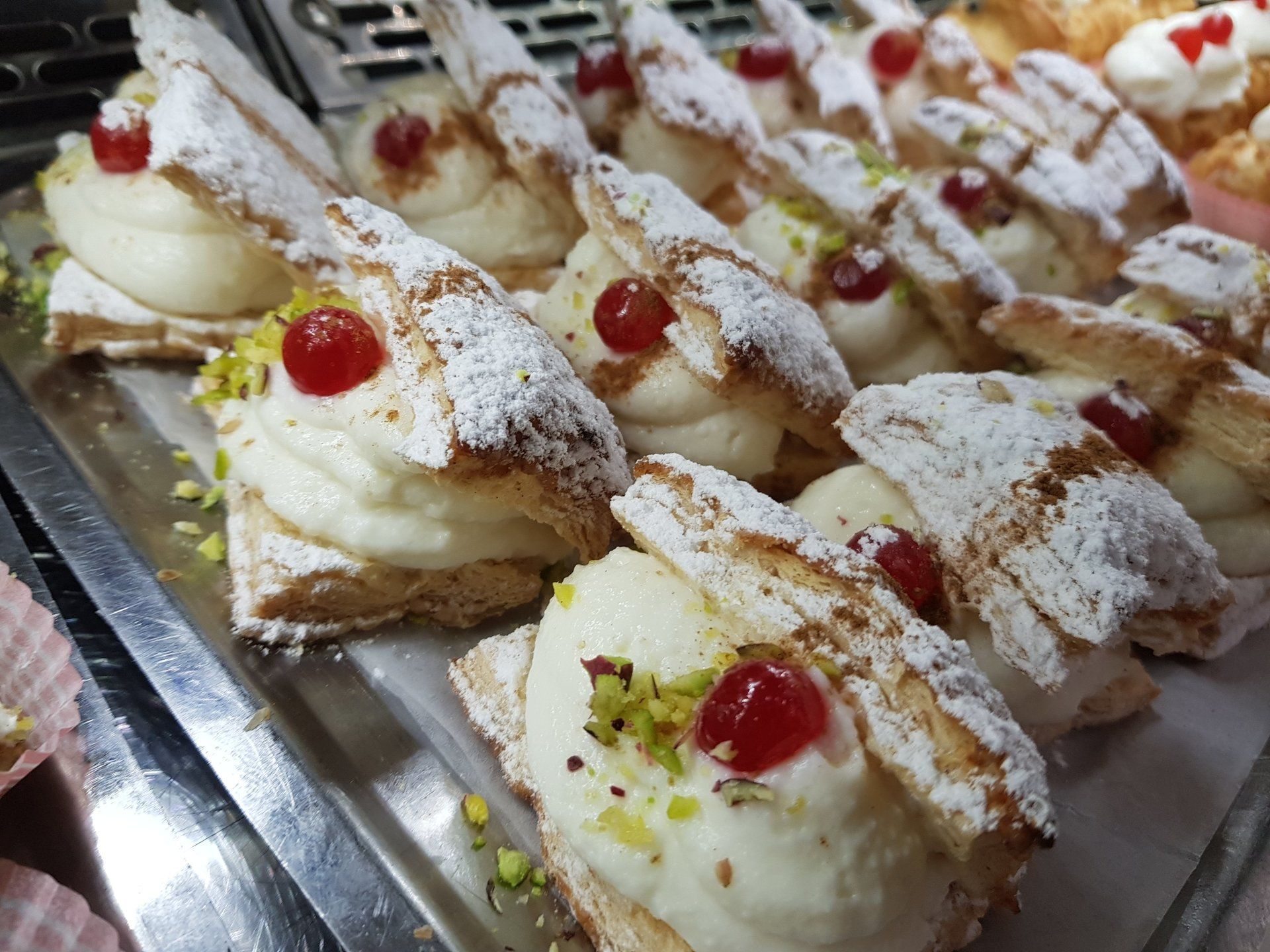 The sweets are round-shaped, made with sponge cake soaked in rose water, filled with ricotta, chocolate chips, and candied fruit. Covered with white icing and finished with a candied cherry on top, they represent the heart of Catania's pastry tradition.